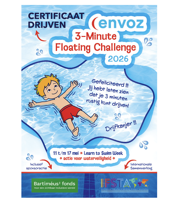 Tijdens International Learn to Swim Week (11 t/m 17 mei 2026) nodigt ENVOZ zweminstituten uit om mee te doen aan de 3-Minute Floating Challenge.